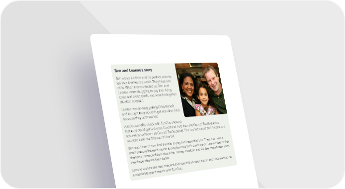Ben and Leanne’s story Ben works full-time and his partner, Leanne, works a few hours a week. They have one child. When they contacted us, Ben and Leanne were struggling to pay their living costs and credit cards, and were finding their situation stressful. Leanne was already getting Child Benefit and thought they wouldn’t get any other help because they both worked. A quick benefits check with Turn2us showed that they could get Universal Credit and help from the Council Tax Reduction scheme (also known as Council Tax Support). This has increased their income and reduced their monthly council tax bill. Ben and Leanne now find it easier to pay their essential bills. They also have a small amount left each month to pay towards their credit cards. Leanne told us that she feels more confident about her money situation and will feel even better when they have cleared their debts. Leanne wishes she had checked their benefit situation earlier and now plans to do a charitable grant search with Turn2us. Page 38