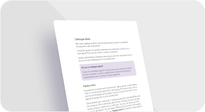 Catalogue debts Mail order catalogues offer a way of buying goods by post and spreading the payments over a set period. Orders for goods and payment collections are sometimes carried out by a local agent. They may be a friend, relative or neighbour. Goods ordered from a catalogue belong to you and cannot be taken back if you do not pay. Treat them as a non-priority debt. Are you a catalogue agent? If you are a catalogue agent, as long as you set up separate accounts for each customer, you (as an agent) should not be held personally responsible for your customers’ missed payments. Payday loans A payday loan is a high-cost short-term loan. Many people use them if they have run out of money before their next payday. The interest rates can be very high and charges will be added if you can’t pay the loan back on the payday. A payday loan is a non-priority debt. Check whether you have given a ‘continuous payment authority’ (CPA) to the loan company. This is where you give the loan company permission to take money using your debit card or credit card. You may not realise you have given this permission. You can stop a CPA by telling the bank or the payday loan company to do so. See our Payday loans fact sheet for how to cancel a CPA and for sample letters to use. Personal debts to family and friends You usually treat these debts as ordinary non-priority debts and make offers of payment in the same way. However, family and friends may agree to receive no payments until your circumstances improve, so you can pay off your other creditors faster. Sometimes, you may want to make higher payments to personal debts. This could be because lending you the money has caused hardship to someone you know, or will affect your relationship. This can be difficult, as your other creditors may be unhappy that you are paying more to a personal debt than is strictly ‘fair’. Explain the reasons to your other creditors. Page 96