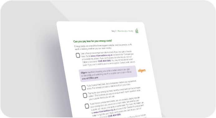 Step 2 Maximise your money 2 Can you pay less for your energy costs? Energy costs are one of the three biggest costs for most households, so it’s worth checking whether you can save money. Use a free price-comparison site to check if you can get a cheaper deal. Go to www.citizensadvice.org.uk and search for ‘Compare gas and electricity prices’. If you can't access the internet, you can call Citizens Advice on 0345 404 0506. You may still be able to switch even if you are in debt to your current supplier. Contact us for advice. Ofgem says that shopping around for a better deal on your gas or electricity and switching a tariff or supplier can cut your bills by around £136 a year. If you have a fixed deal, do a comparison before your agreement ends. Plan ahead and add a note to do this in your diary. Paying for your energy by fixed monthly direct debit can be a cheaper option. This is where you pay an amount each month based on what your supplier thinks you will use. If you have a prepayment meter, you are probably paying more for your energy than you would on a credit meter. See whether your supplier will let you change to a credit meter. For more information, go to www.citizensadvice.org.uk and search for ‘Decide if a prepayment meter is right for you’. If you can't access the internet, you can call Citizens Advice on 0345 404 0506. Using less energy will save you money. Simple Energy Advice has lots of useful information on saving energy, cutting costs and home energy grants. Go to www.simpleenergyadvice.org.uk or call 0800 444 202. If you live in Wales, you may also be able to apply for free home energy-efficiency improvements through the Nest scheme. Go to www.nest.gov.wales or call 0808 808 2244. Page 33