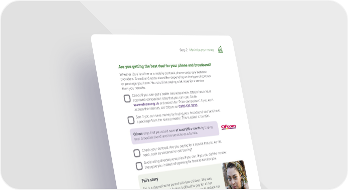 Step 2 Maximise your money 2 Are you getting the best deal for your phone and broadband? Whether it’s a landline or a mobile contract, phone costs vary between providers. Broadband costs also differ depending on the type of contract or package you have. You could be paying a lot more for a service than you need to. Check if you can get a better deal elsewhere. Ofcom has a list of approved comparison sites that you can use. Go to www.ofcom.org.uk and search for ‘Price comparison’. If you can't access the internet, call Ofcom on 0300 123 3333. See if you can save money by buying your broadband and landline in a package from the same provider. This is called a ‘bundle’. Ofcom says that you could save at least £15 a month by buying your broadband and landline services as a bundle. Check your contract. Are you paying for a service that you do not need, such as voicemail or call barring? Avoid using directory enquiries if you can. If you do, dial the number they give you instead of agreeing for them to transfer you. Fai’s story Fai is a stay-at-home parent with two children. She was juggling her bills and finding it difficult to pay for all her essentials. Fai decided to see whether she could reduce her everyday spending and make managing her money easier. Fai started with her grocery bill and drew up a weekly meal plan. She made a shopping list and kept to it. Fai also set herself a challenge to buy at least one cheaper brand each week. By the end of the first month, she had saved over £70 on her grocery costs. Fai then looked at her energy costs. She had been with the same supplier since she had moved into her home. She was surprised at how easy it was to do a price comparison and to change supplier. Fai expects to save around £17 a month on her new energy deal. Fai is also looking at ways to use less energy, which should cut her costs further. The changes Fai has made so far should save her over £1,000 a year. She told us that she ‘gets a buzz’ from saving money and getting a good deal. But best of all, she doesn’t have to worry about her money lasting until the end of the month. Page 35