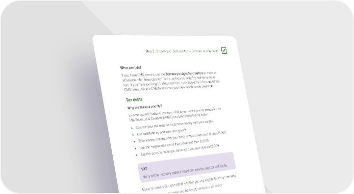Step 3 Choose your debt solution – Common priority debts 3 What can I do? If you have CMS arrears, use the Summary budget for creditors to make an affordable offer towards them. Keep paying your ongoing maintenance as well. If you have a change in circumstances, such as a drop in income, let the CMS know. Ask the CMS to work out your new maintenance payments. Tax debts Why are these a priority? Income tax and National Insurance (NI) arrears are a priority debt because HM Revenue & Customs (HMRC) can take the following action. • Change your tax code so it can take money from your wages. • Use bailiffs to try and take your goods. • Take money directly from your bank account if you owe at least £1,000. • Use the magistrates’ court if you owe less than £2,000. • Ask the court to make you bankrupt if you owe at least £5,000. VAT Many of the recovery options listed can also be used for VAT debts. Some NI arrears can also affect whether you are eligible for certain benefits. If HMRC threatens to make you bankrupt, contact us for advice. What can I do? Contact HMRC as soon as possible. Use the Summary budget for creditors to make an affordable offer. HMRC may ask you to pay more than you can afford. If so, explain that you are offering all that you can and start making payments. If you are in a vulnerable situation, for example, someone close to you has recently died, you are dealing with mental health issues or are elderly or sick, let HMRC know. HMRC should look at your individual circumstances and may be more flexible in how it recovers the debt. You may not agree that you owe the debt to HMRC. If you have been unable to sort out the matter with HMRC, you may need specialist advice. If you are on a low income and can’t afford professional advice, contact TaxAid. Go to www.taxaid.org.uk, or call 0345 120 3779 for more information. For more information, see our Business debts fact sheet. Page 63