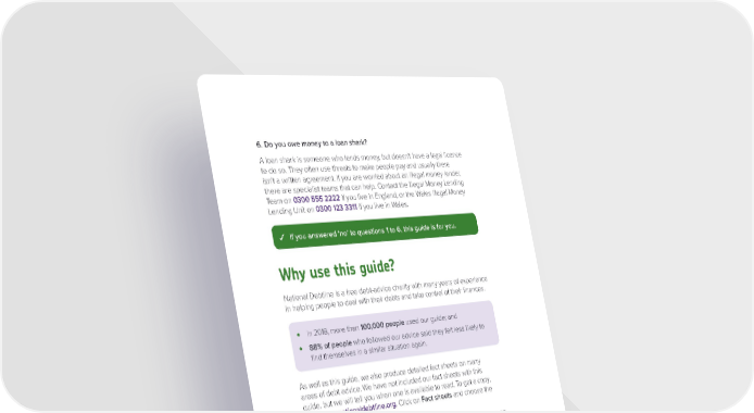 6. Do you owe money to a loan shark? A loan shark is someone who lends money, but doesn’t have a legal licence to do so. They often use threats to make people pay and usually there isn’t a written agreement. If you are worried about an illegal money lender, there are specialist teams that can help. Contact the Illegal Money Lending Team on 0300 555 2222 if you live in England, or the Wales Illegal Money Lending Unit on 0300 123 3311 if you live in Wales. If you answered ‘no’ to questions 1 to 6, this guide is for you. Why use this guide? National Debtline is a free debt-advice charity with many years of experience in helping people to deal with their debts and take control of their finances. • In 2018, more than 100,000 people used our guide; and • 88% of people who followed our advice said they felt less likely to find themselves in a similar situation again. As well as this guide, we also produce detailed fact sheets on many areas of debt advice. We have not included our fact sheets with this guide, but we will tell you when one is available to read. To get a copy, go to www.nationaldebtline.org. Click on Fact sheets and choose the title you want. We will also tell you when there is a sample letter to use. To get a copy, go to www.nationaldebtline.org. Click on Sample letters and choose the letter you want. To help you contact your creditors, we have also included copies of the most commonly used sample letters in this guide. Carlton, 26, from Burnley said: “I have anxiety and was worried about speaking to people I owed money to, so I used your letters. They really helped to make my creditors know what was happening. It was a relief to deal with my situation.” Everyone’s circumstances are different and there may be times when you need some extra help. In this guide, we will recommend you contact us for advice if we think this could be the case. Page 3