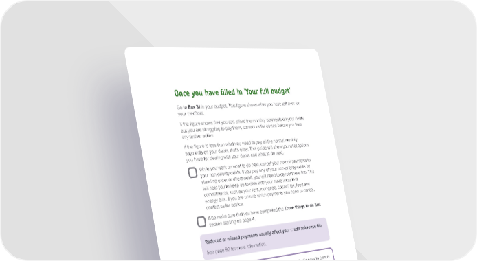 Once you have filled in 'Your full budget' Go to Box 31 in your budget. This figure shows what you have left over for your creditors. If the figure shows that you can afford the monthly payments on your debts but you are struggling to pay them, contact us for advice before you take any further action. If the figure is less than what you need to pay all the normal monthly payments on your debts, that’s okay. This guide will show you what options you have for dealing with your debts and what to do next. While you work on what to do next, cancel your normal payments to your non-priority debts. If you pay any of your non-priority debts by standing order or direct debit, you will need to cancel these too. This will help you to keep up to date with your more important commitments, such as your rent, mortgage, council tax, food and energy bills. If you are unsure which payments you need to cancel, contact us for advice. Also make sure that you have completed the Three things to do first section starting on page 4. Reduced or missed payments usually affect your credit reference file See page 92 for more information. Our research shows that more than 90% of people find it easy to cancel their non-essential direct debits. Page 26