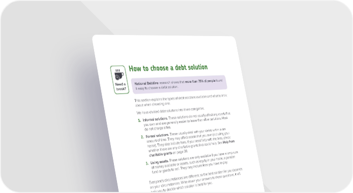 How to choose a debt solution Need a National Debtline research shows that more than 75% of people found Do first break? it easy to choose a debt solution. This section explains the types of debt solutions available and what to think about when choosing one. We have divided debt solutions into three categories. 1. Informal solutions. These solutions do not usually affect any assets that you own and are generally easier to leave than other solutions. Most do not charge a fee. 2. Formal solutions. These usually deal with your debts within a set amount of time. They may affect assets that you own (including your home). They also include fees. If you need help with the fees, check whether there are any charitable grants that could help. See Help from charitable grants on page 39. 3. Using assets. These solutions are only available if you have a lump sum of money available or assets, such as equity in your home, a pension fund or goods to sell. They may include fees you have to pay. Everyone's circumstances are different, so the best solution for you depends on your circumstances. Write down your answers to these questions. It will help you to decide which solution is best for you. How much debt do you owe? Do you have priority debt, non-priority debt or both? What does your budget show you have left over to pay your creditors? See Box 31 of Your full budget. Some debt solutions include a fee. Will you be able to pay this? Do you have assets, such as equity in your home or a car that you own? Page 70