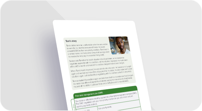 Tom's story Tom's debts became unaffordable when he was unable to work for six months because of illness. He owed almost £6,500 to five non-priority creditors. Tom lived in a rented home. He had a small amount of savings which he needed to help pay his essential living costs. Doctors told Tom that his health situation should get better, so he decided to negotiate payments with his creditors until his situation improved. He made token offers of £1 a month and most of his creditors stopped interest and charges. When Tom's health improved, he was able to return to work. He looked at his budget again and worked out new offers of payment for his debts. He also looked at his debt solutions again, but decided that negotiating with his creditors suited him best of all. Tom contacted his creditors again and told them that his circumstances had changed. He made new offers of payment and started paying the new amounts straightaway. He paid off his debts in just over three and a half years and is now debt-free. Free debt management plan (DMP) You make an affordable monthly payment to a free debt management company (DMC). The DMC negotiates with your non-priority creditors for you and shares out your monthly payments to them. What debts are Non-priority debts. included? Informal solutionIs there a minimum or No. maximum debt amount? How long will it last? You usually need to be able to repay your debts in less than 10 years. Is there a fee? Always check for fees. We recommend using a free service, such as those offered by PayPlan or StepChange. Some things to consider You need arrangements in place for any priority debts first. You may be able to change your payments if your circumstances change. A DMP aims to pay your debts in full. This may take some time. See our Debt You need to be able to pay a minimum amount to your management plans debts every month. (DMPs) fact sheet. Contact us if you want to ask about a free DMP. Page 72
