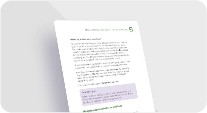 Step 3 Choose your debt solution – Common priority debts 3 What if my landlord starts court action? You cannot be evicted from your home without a court order. Even if you are taken to court, this does not mean you will automatically lose your home. The court’s power to let you stay depends on the type of tenancy you have and other factors, such as the amount of arrears you owe. Our Rent arrears fact sheet gives more information on what a court can do for different tenancy types. Even if the court decides that you cannot stay in your home, you will not be evicted on the day of your possession hearing. If your landlord starts court action, the court will send you forms to fill in and usually set a hearing date. If you get court forms, contact us for advice. Even if you have already been to court, it is not too late. You may still be able to ask the court to keep your home. If you have missed a payment set by the court or have received an eviction notice, contact us for advice straightaway. For more information, see our Rent arrears fact sheet. Know your rights Certain tenancies do not give you the same rights as mentioned in this section, for example, if you are a boarder, live in a hostel or are a squatter. Contact us for advice if this applies to you. Mortgage arrears and other secured loans Why are these a priority? Mortgage arrears are a priority debt because you could lose your home if you do not pay them. The advice in this section also applies if you have missed payments on a secured loan or second mortgage. A secured loan is similar to a mortgage because you give your lender security (usually against your home), which they can use if you cannot keep up with the payments. Check your loan agreements to see if any of them are secured on your home. If they are, treat them as a priority debt. Page 55