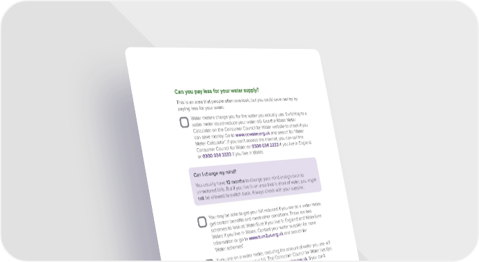 Can you pay less for your water supply? This is an area that people often overlook, but you could save money by paying less for your water. Water meters charge you for the water you actually use. Switching to a water meter could reduce your water bill. Use the Water Meter Calculator on the Consumer Council for Water website to check if you can save money. Go to www.ccwater.org.uk and search for ‘Water Meter Calculator’. If you can't access the internet, you can call the Consumer Council for Water on 0300 034 2222 if you live in England or 0300 034 3333 if you live in Wales. Can I change my mind? You usually have 12 months to change your mind and go back to unmetered bills. But if you live in an area that is short of water, you might not be allowed to switch back. Always check with your supplier. You may be able to get your bill reduced if you are on a water meter, get certain benefits and meet other conditions. There are two schemes to look at: WaterSure if you live in England and WaterSure Wales if you live in Wales. Contact your water supplier for more information or go to www.turn2us.org.uk and search for ‘Water schemes’. If you are on a water meter, reducing the amount of water you use will also help to reduce your bill. The Consumer Council for Water has tips on how to use less water. Go to www.ccwater.org.uk. If you can't access the internet, you can call the Consumer Council for Water on 0300 034 2222 if you live in England or 0300 034 3333 if you live in Wales. Most water companies have special tariffs that offer lower bills for some customers. Contact your supplier and ask for details. Carry on being money smart You can keep up to date with money-saving ideas by signing up to a free weekly money tips email at www.moneysavingexpert.com. 13 million people already do. Page 34