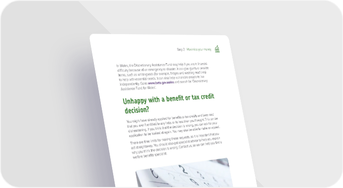 Step 2 Maximise your money 2 In Wales, the Discretionary Assistance Fund may help if you are in financial difficulty because of an emergency or disaster. It can give grants or provide items, such as white goods (for example, fridges and washing machines) to help with essential needs. It can also help vulnerable people to live independently. Go to www.beta.gov.wales and search for ‘Discretionary Assistance Fund for Wales’. Unhappy with a benefit or tax credit decision? You might have already applied for benefits or tax credits and been told that you aren’t entitled to any help, or to less than you thought. This can be disheartening. If you think that the decision is wrong, you can ask for your application to be looked at again. You may also be able to make an appeal. There are time limits for making these requests, so it is important that you act straightaway. You should also get specialist advice to help you explain why you think the decision is wrong. Contact us, so we can help you find a welfare benefits specialist. Page 41