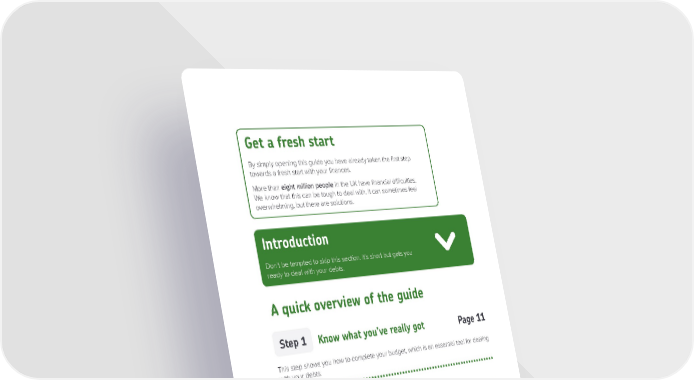 Get a fresh start By simply opening this guide you have already taken the first step towards a fresh start with your finances. More than eight million people in the UK have financial difficulties. We know that this can be tough to deal with. It can sometimes feel overwhelming, but there are solutions. Introduction Don't be tempted to skip this section. It's short but gets you ready to deal with your debts. A quick overview of the guide Step 1 Know what you’ve really got Page 11 This step shows you how to complete your budget, which is an essential tool for dealing with your debts. Step 2 Maximise your money Page 29 This step looks at how to make the most of your money. Step 3 Choose your debt solution Page 43 This step looks at the different solutions you have for dealing with your debts. For a full list of what this guide contains, see the inside back cover. Page 1