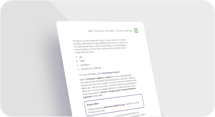 Step 3 Choose your debt solution – Common priority debts 3 Energy UK is a trade association. If your energy supplier is a member, they should follow the Energy UK Safety Net guidance. You should not be disconnected if your supplier knows that you cannot protect your personal welfare, or the personal welfare of other members of your household, due to your: • age; • health; • disability; or • severe financial difficulty. For more information, go to www.energy-uk.org.uk. Use the Summary budget for creditors to make an affordable offer. You need to cover the cost of the energy you are using plus an amount towards the arrears. Your supplier will usually want you to pay the arrears before your next bill is due. If you can’t do this, start paying what you can afford and remind your supplier that they should take into account your ability to pay. See our Ask your energy supplier to accept affordable payments sample letter. Sample letters To get a copy go to www.nationaldebtline.org or contact us and we will send you a copy. If you get certain benefits, you can ask the Department for Work and Pensions (DWP) to take money from your benefit to pay towards your arrears. Unless you are on a prepayment meter, they will also take an amount to pay towards your ongoing energy costs. What if my energy supplier still threatens to cut off my supply? It is rare for gas and electricity suppliers to cut off your supply. This should be a last resort and your supplier should give you notice. You can usually avoid being disconnected if you agree to repay your debt at a rate you can afford. This could be by instalments, having money taken from certain benefits or through a prepayment meter. If your supplier is threatening to cut off your supply, get advice straightaway, as it can happen within a few weeks. Contact Citizens Advice consumer service. Go to www.citizensadvice.org.uk or call 0345 404 0506. For more information, see our Energy debts fact sheet. Page 59