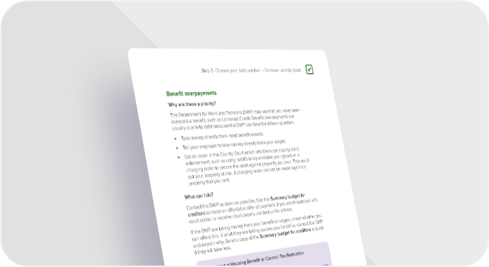Step 3 Choose your debt solution – Common priority debts 3 Benefit overpayments Why are these a priority? The Department for Work and Pensions (DWP) may say that you have been overpaid a benefit, such as Universal Credit. Benefit overpayments are usually a priority debt because the DWP can take the following action. • Take money directly from most benefit awards. • Tell your employer to take money directly from your wages. • Get an order in the County Court which lets them use county court enforcement, such as using bailiffs to try and take your goods or a charging order to secure the debt against property you own. This could put your property at risk. A charging order cannot be made against a property that you rent. What can I do? Contact the DWP as soon as possible. Use the Summary budget for creditors to make an affordable offer of payment. If you are threatened with court action, or receive court papers, contact us for advice. If the DWP are taking money from your benefit or wages, check whether you can afford this. If what they are taking causes you hardship, contact the DWP and explain why. Send a copy of the Summary budget for creditors and ask if they will take less. Do you have a Housing Benefit or Council Tax Reduction overpayment? Different rules apply if the council says you have been overpaid Housing Benefit or Council Tax Reduction (also known as Council Tax Support). Contact us for advice. Page 65