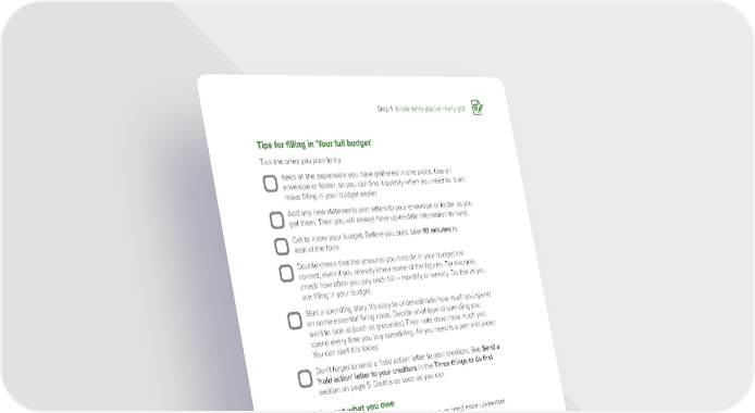 Step 1 Know what you’ve really got 1 Tips for filling in 'Your full budget' Tick the ones you plan to try. Keep all the paperwork you have gathered in one place. Use an envelope or folder, so you can find it quickly when you need to. It will make filling in your budget easier. Add any new statements and letters to your envelope or folder as you get them. Then you will always have up-to-date information to hand. Get to know your budget. Before you start, take 10 minutes to look at the form. Double-check that the amounts you include in your budget are correct, even if you already know some of the figures. For example, check how often you pay each bill – monthly or weekly. Do this as you are filling in your budget. Start a spending diary. It’s easy to underestimate how much you spend on some essential living costs. Decide what type of spending you want to look at (such as groceries). Then note down how much you spend every time you buy something. All you need is a pen and paper. You can start this today. Don’t forget to send a 'hold action' letter to your creditors. See Send a 'hold action' letter to your creditors in the Three things to do first section on page 5. Do this as soon as you can. Finding out what you owe If you haven’t kept the letters from your creditors, or need more up-to-date figures, contact your creditors and ask them how much you owe. If you would prefer not to speak to them on the phone, send them an email or letter instead. If you speak to your creditors about what you owe, do not agree to a payment arrangement. It is important that you only offer what you can afford to pay. You won’t know what this is until you have done Your full budget. Don’t worry if you can’t remember who you owe money to, or can’t find your creditors’ details. We can discuss ways of finding this information, so contact us for advice. Page 15