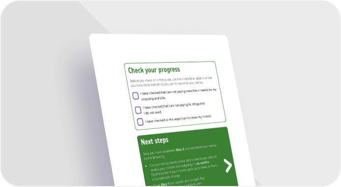 Check your progress Before you move on in the guide, use the checklist to make sure that you have done everything you can to maximise your money. I have checked that I am not paying more than I need to for my shopping and bills. I have checked that I am not paying for things that I do not need. I have checked all the ways I can increase my income. Next steps Now you have completed Step 2 and maximised your money, do the following. • Carry on being money smart. Add a note to your diary to review your income and outgoings in six months. Do this earlier if your income goes up or down, or if your circumstances change. • Go to Step 1 and update your budget. See what difference you have made to your income and outgoings. • If your budget shows that you don’t have enough money to pay your essential living costs, contact us for advice. • If your budget shows that you can pay your essential living costs, go to Step 3 to deal with your debts. Here to help If you are unsure of anything in this step, have extra questions or just want to talk through your situation, contact us for advice. Page 42