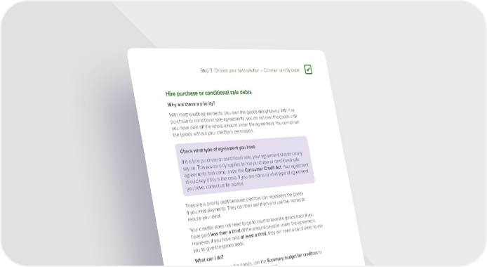 Step 3 Choose your debt solution – Common priority debts 3 Hire purchase or conditional sale debts Why are these a priority? With most credit agreements, you own the goods straightaway. With hire purchase or conditional sale agreements, you do not own the goods until you have paid off the whole amount under the agreement. You cannot sell the goods without your creditor’s permission. Check what type of agreement you have If it is hire purchase or conditional sale, your agreement should clearly say so. This advice only applies to hire purchase or conditional sale agreements that come under the Consumer Credit Act. Your agreement should say if this is the case. If you are not sure what type of agreement you have, contact us for advice. They are a priority debt because creditors can repossess the goods if you miss payments. They can then sell them and use the money to reduce your debt. Your creditor does not need to go to court to take the goods back if you have paid less than a third of the amount payable under the agreement. However, if you have paid at least a third, they will need a court order to ask you to give the goods back. What can I do? If you want to keep the goods, use the Summary budget for creditors to make an affordable offer towards the arrears. Explain to your creditor why it is important that you keep the goods. Do you have a personal contract purchase (PCP) agreement? PCPs are a type of hire purchase agreement and follow the same rules. However, because of the way payments are organised in PCPs your options are usually more limited. If you have a PCP agreement, contact us for advice. Page 67