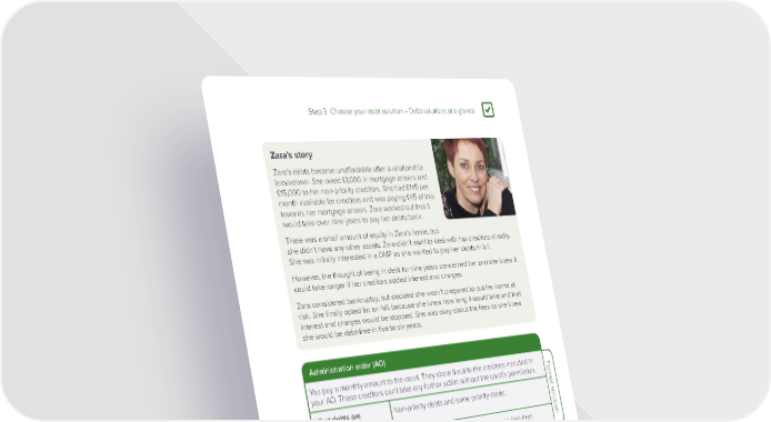 Step 3 Choose your debt solution – Debt solutions at a glance 3 Zara’s story Zara’s debts became unaffordable after a relationship breakdown. She owed £1,000 in mortgage arrears and £15,000 to her non-priority creditors. She had £145 per month available for creditors and was paying £45 of this towards her mortgage arrears. Zara worked out that it would take over nine years to pay her debts back. There was a small amount of equity in Zara’s home, but she didn’t have any other assets. Zara didn’t want to deal with her creditors directly. She was initially interested in a DMP as she wanted to pay her debts in full. However, the thought of being in debt for nine years concerned her and she knew it could take longer if her creditors added interest and charges. Zara considered bankruptcy, but decided she wasn’t prepared to put her home at risk. She finally opted for an IVA because she knew how long it would take and that interest and charges would be stopped. She was okay about the fees as she knew she would be debt-free in five to six years. Administration order (AO) You pay a monthly amount to the court. They share it out to the creditors included in Formal solution your AO. These creditors can’t take any further action without the court’s permission. What debts are Non-priority debts and some priority debts. included? Is there a minimum or You need at least two debts, but must owe less than maximum debt amount? £5,000. How long will it last? No time limit, but the court may agree to set one. Is there a fee? The court takes 10% of your monthly payment as costs. Some things to consider You need to have a county court or high court judgment in your name. You need to be able to afford payments to the AO. Interest and charges are stopped. Debts have to be paid in full unless you ask the court to limit how long you pay for. Courts often agree a three-year limit. See our Administration Creditors can object, but the court will decide whether to orders fact sheet. make the AO. Page 77