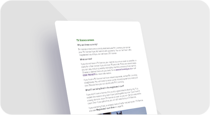 TV licence arrears Why are these a priority? TV licence arrears are a priority debt because TV Licensing can cancel your TV licence if you fall behind with payments. You can be fined in the magistrates' court if you do not have a TV licence. What can I do? If you do not have a TV licence, you need to buy one as soon as possible, or apply for a free licence if you are over 75 years old. There are several ways you can pay, including weekly, fortnightly, monthly and every three months. Choose a method that suits you best. Go to www.tvlicensing.co.uk or call 0300 790 6071 for more information. If you have a TV licence but have missed payments, contact TV Licensing straightaway. You will need to make up the missed payments to keep your plan. Discuss how you can do this with TV Licensing. What if I am being fined in the magistrates’ court? If you don’t have a licence, it is usually a good idea to plead guilty. Fully explain the reasons why, even if you just forgot to buy one. If you haven’t already done so, buy a TV licence as soon as you can. Send a copy to the court. Even if you get a fine, you will still need to buy a TV licence. If you are being fined, or already have a fine for not paying your TV licence, also see Magistrates’ court fines on page 61. Page 60