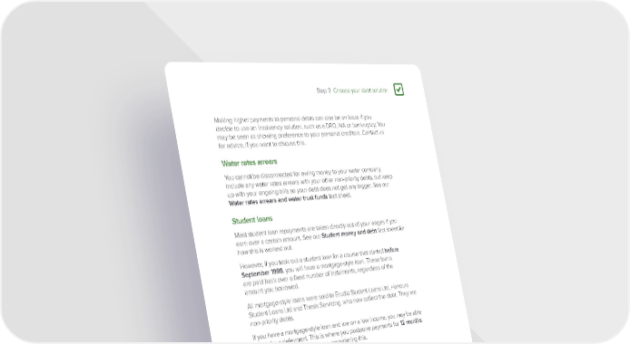 Step 3 Choose your debt solution 3 Making higher payments to personal debts can also be an issue if you decide to use an insolvency solution, such as a DRO, IVA or bankruptcy. You may be seen as showing preference to your personal creditors. Contact us for advice, if you want to discuss this. Water rates arrears You cannot be disconnected for owing money to your water company. Include any water rates arrears with your other non-priority debts, but keep up with your ongoing bills so your debt does not get any bigger. See our Water rates arrears and water trust funds fact sheet. Student loans Most student loan repayments are taken directly out of your wages if you earn over a certain amount. See our Student money and debt fact sheet for how this is worked out. However, if you took out a student loan for a course that started before September 1998, you will have a mortgage-style loan. These loans are paid back over a fixed number of instalments, regardless of the amount you borrowed. All mortgage-style loans were sold to Erudio Student Loans Ltd, Honours Student Loans Ltd and Thesis Servicing, who now collect the debt. They are non-priority debts. If you have a mortgage-style loan and are on a low income, you may be able to ask for a deferment. This is where you postpone payments for 12 months. Contact us for advice, if you are considering this. Mortgage shortfalls You may still owe money if your home was repossessed or you handed back the keys to your mortgage lender. This is called a mortgage shortfall. They can be quite large debts, but they are still a non-priority. Your lender has longer than most non-priority creditors to take court action for any mortgage capital that you owe. However, there are guidelines that your lender should also follow. See our Mortgage shortfalls fact sheet. What is mortgage capital? Mortgage capital is the money that you originally borrowed. It does not include the interest you were charged to borrow the money. Page 97
