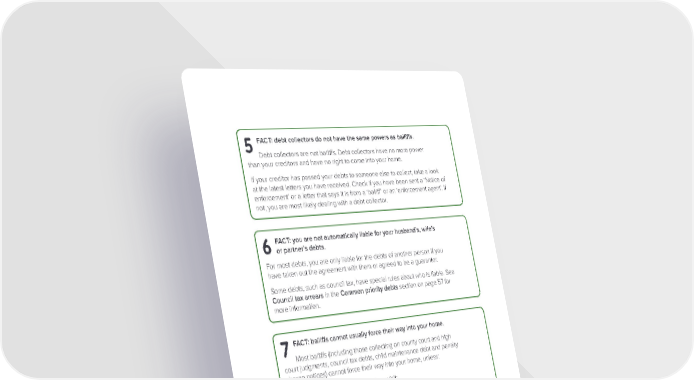 FACT: debt collectors do not have the same powers as bailiffs. 5 Debt collectors are not bailiffs. Debt collectors have no more power than your creditors and have no right to come into your home. If your creditor has passed your debts to someone else to collect, take a look at the latest letters you have received. Check if you have been sent a ‘Notice of enforcement' or a letter that says it is from a ‘bailiff’ or an ‘enforcement agent’. If not, you are most likely dealing with a debt collector. FACT: you are not automatically liable for your husband’s, wife’s 6 or partner’s debts. For most debts, you are only liable for the debts of another person if you have taken out the agreement with them or agreed to be a guarantor. Some debts, such as council tax, have special rules about who is liable. See Council tax arrears in the Common priority debts section on page 57 for more information. FACT: bailiffs cannot usually force their way into your home. 7 Most bailiffs (including those collecting on county court and high court judgments, council tax debts, child maintenance debt and penalty charge notices) cannot force their way into your home, unless: • you have let them in on a previous visit; • they took control of your goods; and • you have broken any agreement you made with them. Magistrates’ court bailiffs can force entry to your home, but only if it is reasonable to do so. We rarely see this happen. HM Revenue & Customs (HMRC) bailiffs would need to apply to the court for a warrant to let them force entry to your home. We rarely see this happen. If a bailiff is threatening to force entry to your home, contact us for advice. We use the term ‘bailiffs’ Bailiffs are also known as ‘enforcement agents’. In this guide we use the term bailiffs. Page 9