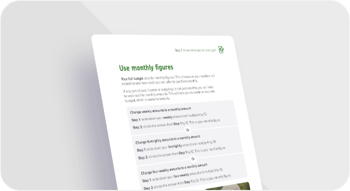 Step 1 Know what you’ve really got 1 Use monthly figures Your full budget asks for monthly figures. This is because your creditors will expect to see how much you can offer to pay them monthly. If any part of your income or outgoings is not paid monthly, you will need to work out the monthly amounts. This will help you to create an accurate budget, which is easier to keep to. Change weekly amounts to a monthly amount Step 1: write down your weekly amount and multiply it by 52. Step 2: divide the answer from Step 1 by 12. This is your monthly figure. Or Change fortnightly amounts to a monthly amount Step 1: write down your fortnightly amount and multiply it by 26. Step 2: divide the answer from Step 1 by 12. This is your monthly figure. Or Change four-weekly amounts to a monthly amount Step 1: write down your four-weekly amount and multiply it by 13. Step 2: divide the answer from Step 1 by 12. This is your monthly figure. Example Joe gets paid £50 every four weeks from a private pension, so he needs to use the four-weekly instructions. Joe writes down his four-weekly payment of £50 and multiplies it by 13 = £650 (Step 1). This gives Joe his yearly amount. He then divides £650 by 12 = £54.17 (Step 2). This gives Joe his monthly figure. If you need more help working out your monthly figures, contact us for advice. Or, you can use our online budget tool which will do it for you. Go to www.nationaldebtline.org and click on Your budget. Page 17