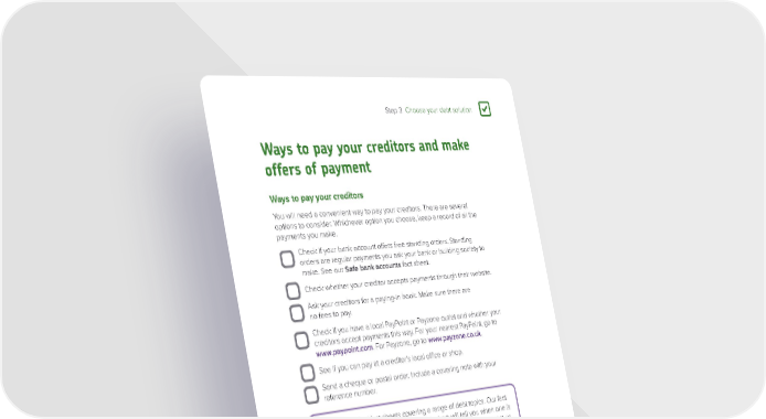 Step 3 Choose your debt solution 3 Ways to pay your creditors and make offers of payment Ways to pay your creditors You will need a convenient way to pay your creditors. There are several options to consider. Whichever option you choose, keep a record of all the payments you make. Check if your bank account offers free standing orders. Standing orders are regular payments you ask your bank or building society to make. See our Safe bank accounts fact sheet. Check whether your creditor accepts payments through their website. Ask your creditors for a paying-in book. Make sure there are no fees to pay. Check if you have a local PayPoint or Payzone outlet and whether your creditors accept payments this way. For your nearest PayPoint, go to www.paypoint.com. For Payzone, go to www.payzone.co.uk. See if you can pay at a creditor’s local office or shop. Send a cheque or postal order. Include a covering note with your reference number. We have detailed fact sheets covering a range of debt topics. Our fact sheets are not included with this guide, but we will tell you when one is available. To get a copy, go to www.nationaldebtline.org or contact us and we will send you a copy. Page 51