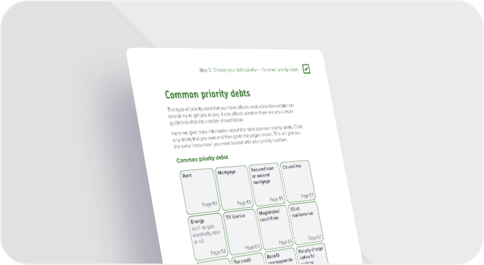 Step 3 Choose your debt solution – Common priority debts 3 Common priority debts The type of priority debt that you have affects what action the creditor can take to try to get you to pay. It also affects whether there are any rules or guidelines that the creditor should follow. Here we give more information about the most common priority debts. Circle any debts that you owe and then go to the pages shown. This will give you the extra ‘know-how’ you need to deal with your priority creditors. Common priority debts Rent Mortgage Secured loan Council tax or second mortgage Page 54 Page 55 Page 55 Page 57 Energy TV licence Magistrates’ Child such as gas, court fines maintenance electricity, coal or oil Page 58 Page 60 Page 61 Page 62 Tax debts Tax credit Benefit Penalty charge such as income overpayments overpayments notice for tax, National parking Insurance and VAT Page 63 Page 64 Page 65 Page 66 Hire purchase Bill of sale or conditional also called a sale logbook loan Page 67 Page 69 Be aware that as well as the extra powers priority creditors have, most can also recover money in the same way as non-priority creditors. See What can my non-priority creditors do if I don’t pay the debt? on page 92. Page 53