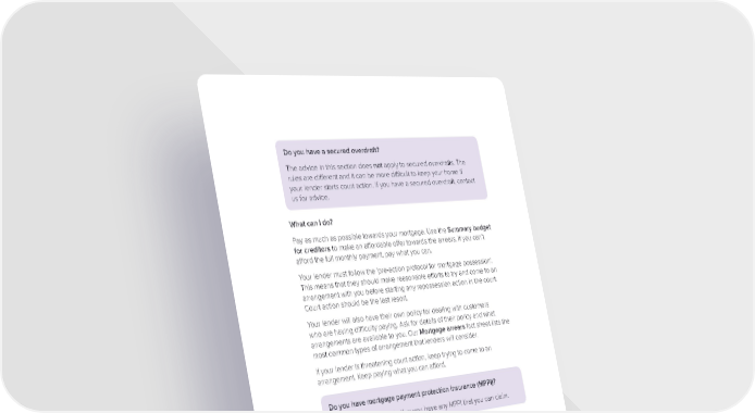 Do you have a secured overdraft? The advice in this section does not apply to secured overdrafts. The rules are different and it can be more difficult to keep your home if your lender starts court action. If you have a secured overdraft, contact us for advice. What can I do? Pay as much as possible towards your mortgage. Use the Summary budget for creditors to make an affordable offer towards the arrears. If you can’t afford the full monthly payment, pay what you can. Your lender must follow the 'pre-action protocol for mortgage possession'. This means that they should make reasonable efforts to try and come to an arrangement with you before starting any repossession action in the court. Court action should be the last resort. Your lender will also have their own policy for dealing with customers who are having difficulty paying. Ask for details of their policy and what arrangements are available to you. Our Mortgage arrears fact sheet lists the most common types of arrangement that lenders will consider. If your lender is threatening court action, keep trying to come to an arrangement. Keep paying what you can afford. Do you have mortgage payment protection insurance (MPPI)? Remember to check whether you have any MPPI that you can claim. What if my lender starts court action? This doesn’t mean that you will lose your home, but you do need to act quickly. You cannot be evicted from your home without a court order and cannot be evicted on the day of your repossession hearing. If your lender starts court action, the court will send you forms to fill in and set a hearing date. The court will look at what is fair for you and your lender. It is important that you let the court know what you want and how much you can pay. If you get court forms, contact us for advice. Even if you have already been to court, it is not too late. You may still be able to ask the court to keep your home. If you have missed a payment set by the court, or have received an eviction notice, contact us for advice straightaway. For more information, see our Mortgage arrears fact sheet. Page 56