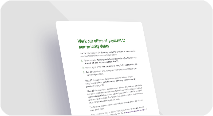 Work out offers of payment to non-priority debts Use the information in the Summary budget for creditors to work out what you have left to offer your non-priority creditors. 1. Take away your Total payments to priority creditors (Box 33) from your Amount left over for your creditors (Box 31). 2. Put this figure in the Total payments to non-priority creditors (Box 35). 3. Box 35 now shows what money you have left to share between your non-priority creditors. If Box 35 shows that you don’t have any money left over for your non-priority creditors, go to No money left to pay your non-priority creditors? on page 90. If Box 35 shows that you do have money left over, the next step is to divide this amount between your non-priority creditors. The best way to do this is by pro-rata distribution. It means that all your creditors get a fair share of what you have available. The largest debt gets the most of what you have left and the smallest debt gets the least. The following explains how to work out your pro-rata payments. You will need a calculator. If you prefer, you can use our online budget. It adds up your figures and does the pro-rata calculations for you. Go to www.nationaldebtline.org and click on Your budget. Work out your pro-rata payments Use your Summary budget for creditors to work out your pro-rata payments. Step 1: list all your non-priority creditors and the amount you owe each of them. Step 2: add up the total amount you owe to all your non-priority creditors (Box 34). You will then need to follow Steps 3 and 4 for each of your non-priority debts. Step 3: multiply the amount you have left over to pay your non-priority creditors (Box 35) by the amount of debt that you owe an individual creditor. Step 4: then divide the figure you worked out in Step 3 by the total amount you owe to all your non-priority creditors (Box 34). This will give you the payment offer you should make to your creditor. You can round this figure up or down to the nearest £1. Page 86