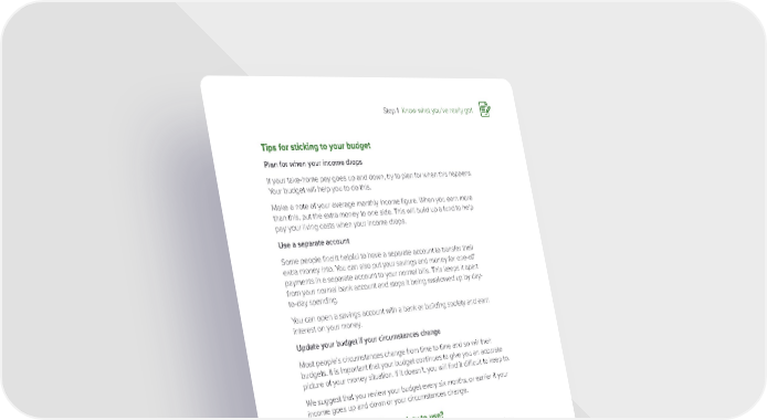 Step 1 Know what you’ve really got 1 Tips for sticking to your budget Plan for when your income drops If your take-home pay goes up and down, try to plan for when this happens. Your budget will help you to do this. Make a note of your average monthly income figure. When you earn more than this, put the extra money to one side. This will build up a fund to help pay your living costs when your income drops. Use a separate account Some people find it helpful to have a separate account to transfer their extra money into. You can also put your savings and money for one-off payments in a separate account to your normal bills. This keeps it apart from your normal bank account and stops it being swallowed up by day- to-day spending. You can open a savings account with a bank or building society and earn interest on your money. Update your budget if your circumstances change Most people’s circumstances change from time to time and so will their budgets. It is important that your budget continues to give you an accurate picture of your money situation. If it doesn’t, you will find it difficult to keep to. We suggest that you review your budget every six months, or earlier if your income goes up and down or your circumstances change. Which bank or building society to use? If you owe money to a bank or building society and do not pay them, they can take money from an account you have with them to pay the debt. This includes savings accounts. It is called the ‘right of set-off’. To avoid this happening, save money with a bank or building society that you do not owe money to. Make sure that you use a savings account that is best for you. The Money Advice Service can give you advice about different ways of saving (including credit union accounts) and what to look out for. Go to www.moneyadviceservice.org.uk and search for ‘Types of savings’ or call 0800 138 7777. Page 27
