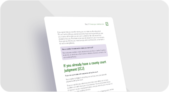 Step 3 Choose your debt solution 3 If you agree that you owe the money, you can make an offer of payment. This will be the offer you worked out earlier. If you don’t agree that you owe all, or some, of the debt, you can put in a defence. We have several fact sheets to help you. The best one to read will depend on your circumstances. If you get court forms, you need to reply within set timescales, so contact us for advice straightaway. Has a creditor threatened to make you bankrupt? We rarely see creditors make people bankrupt. If your creditor threatens to do this, or sends you a form called a ‘statutory demand’, contact us for advice straightaway. If you already have a county court judgment (CCJ) If you are up to date with payments set by the court Your creditor is limited in what they can do if you are up to date with payments set by the court. They can ask that you attend court so that a court officer can ask you questions on oath about your circumstances. You could be asked about things such as your employment status, who you work for, your income and whether you own anything of value. Your creditor may also be able to ask the court for a charging order, but this will depend on when they originally applied for the CCJ. If you have not paid what the court ordered you to pay If you do not pay what the court orders you to pay, your creditor could take further action. This includes: • asking for a charging order; • using bailiffs to try and take your goods; • asking for money to be taken directly from your wages; and • freezing funds in your bank account or telling someone who owes you money to pay them instead. Page 93