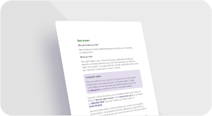 Rent arrears Why are these a priority? Rent arrears are a priority debt because you could lose your home if you do not pay them. What can I do? Your right to stay in your home and how your landlord should treat you depends on the type of tenancy you have. Each type gives you different rights. For example, it is usually easier for a private landlord to evict you from your home than it would be for a council landlord. Immigration status There are different rules if you live in England and are being asked to leave your home because of your immigration status. Contact us for advice. You will also need specialist immigration advice. Go to www.gov.uk and search for ‘Find an immigration adviser’. If you live in England and are unsure what type of tenancy you have, use Shelter’s Tenancy rights checker. Go to www.shelter.org.uk, or call Shelter on 0808 800 4444. If you live in Wales, call Shelter Cymru on 0345 075 5005. Get a breakdown of your rent account from your landlord. It is important to check that all rent payments have been added to your account. This is because with some tenancies, the amount of arrears can affect your right to stay in your home. Use the Summary budget for creditors to make an affordable offer towards the arrears. Keep paying your normal rent. If you can’t afford the full monthly payment, pay what you can. If you rent your home from a social landlord (such as the council or a housing association), your landlord must follow the 'pre-action protocol for possession' by social landlords. This means that they should make reasonable efforts to try and come to an arrangement with you before starting any action in the court to take possession of your home. Page 54
