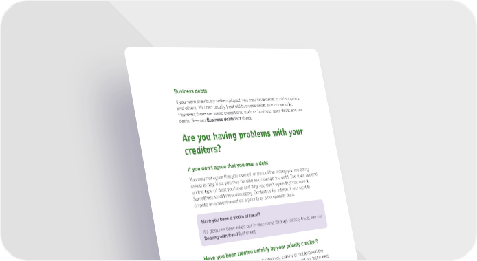Business debts If you were previously self-employed, you may have debts to old suppliers and others. You can usually treat old business debts as a non-priority. However, there are some exceptions, such as business rates debts and tax debts. See our Business debts fact sheet. Are you having problems with your creditors? If you don’t agree that you owe a debt You may not agree that you owe all, or part, of the money you are being asked to pay. If so, you may be able to challenge the debt. The rules depend on the type of debt you have and why you don’t agree that you owe it. Sometimes strict timescales apply. Contact us for advice, if you want to dispute an amount owed on a priority or a non-priority debt. Have you been a victim of fraud? If a debt has been taken out in your name through identity fraud, see our Dealing with fraud fact sheet. Have you been treated unfairly by your priority creditor? If you feel that your creditor has treated you unfairly or not followed the correct procedure, you have the right to complain. Many of our fact sheets include information on how to complain. You can also contact us for advice. Have you been treated unfairly by your non-priority creditor? You can complain if you feel that your creditor (or a debt collector) has treated you unfairly, or not followed the correct procedure. You will need to complain to your creditor (or debt collector) first and follow their complaints process. After that, you can usually ask the FOS to look at your complaint. For more information on complaining to the FOS, go to www.financial-ombudsman.org.uk or call 0800 023 4567. Also see our Complaining about your lender fact sheet. Page 98