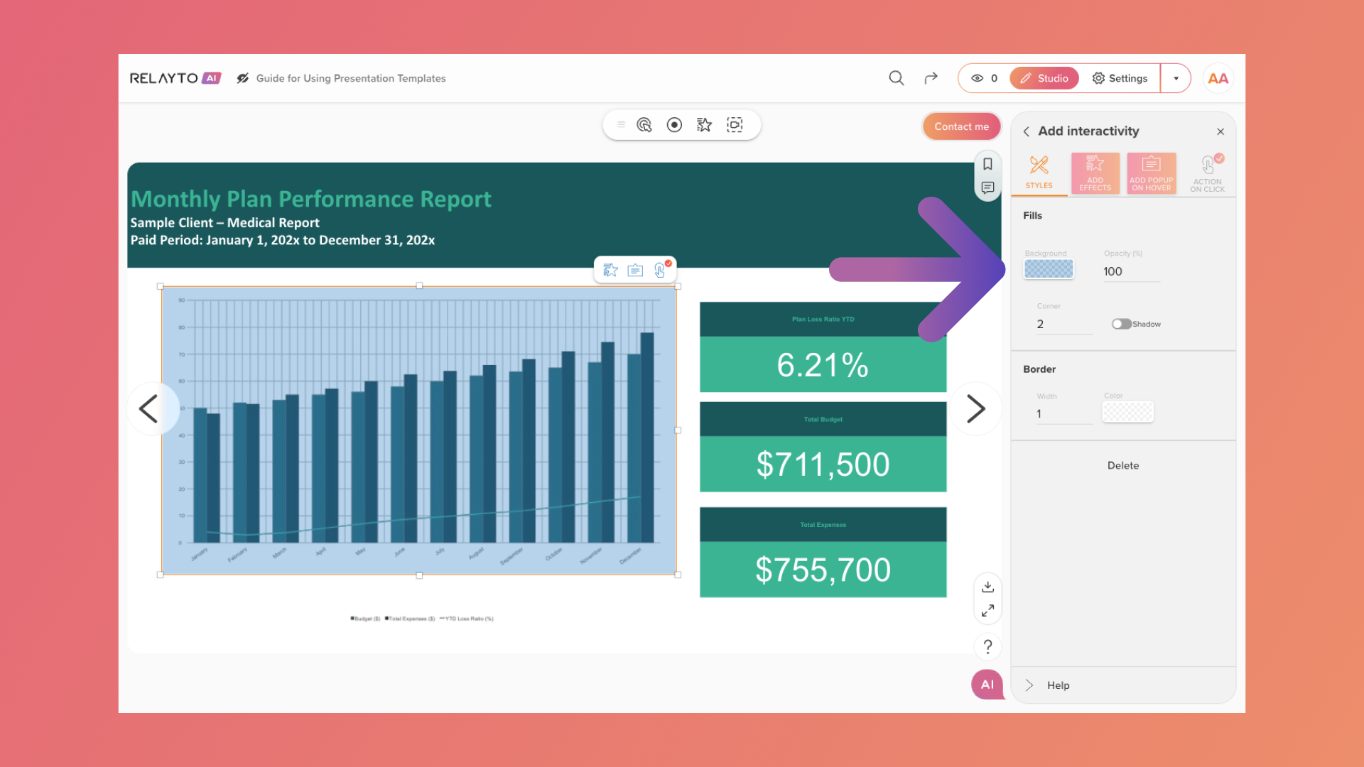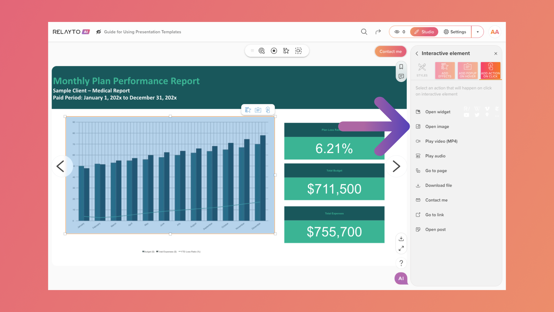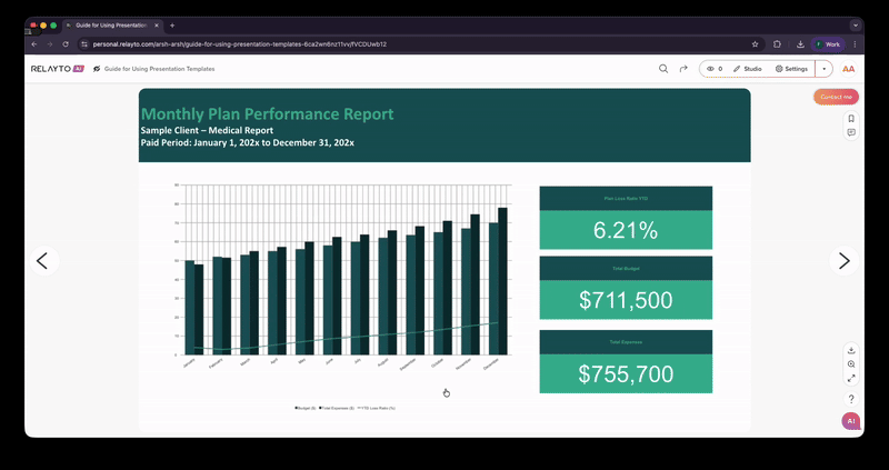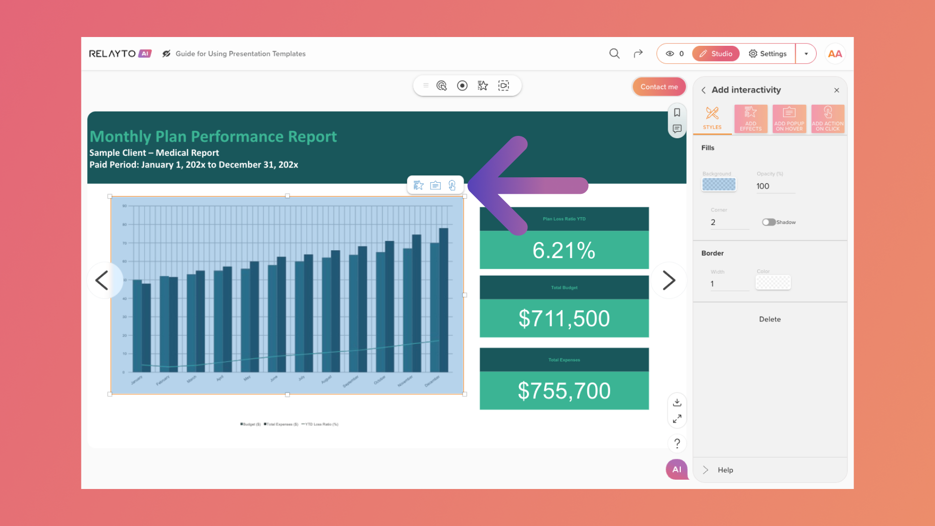 If your visuals—like charts or graphs—appear too small within your RELAYTO experience, you can easily resize or make them interactive for better visibility. Follow these steps: