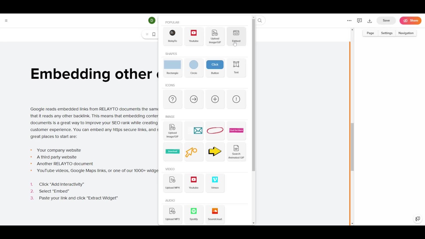 Embedding other content Google reads embedded links from RELAYTO documents the same way that it reads any other backlink. This means that embedding content in your documents is a great way to improve your SEO rank while creating a rich customer experience. You can embed any https secure links, and some great places to start are: • Your company website • A third party website • Another RELAYTO document • YouTube videos, Google Maps links, or one of our 1000+ widgets 1. Click “Add Interactivity” 2. Select “Embed” 3. Paste your link and click “Extract Widget”