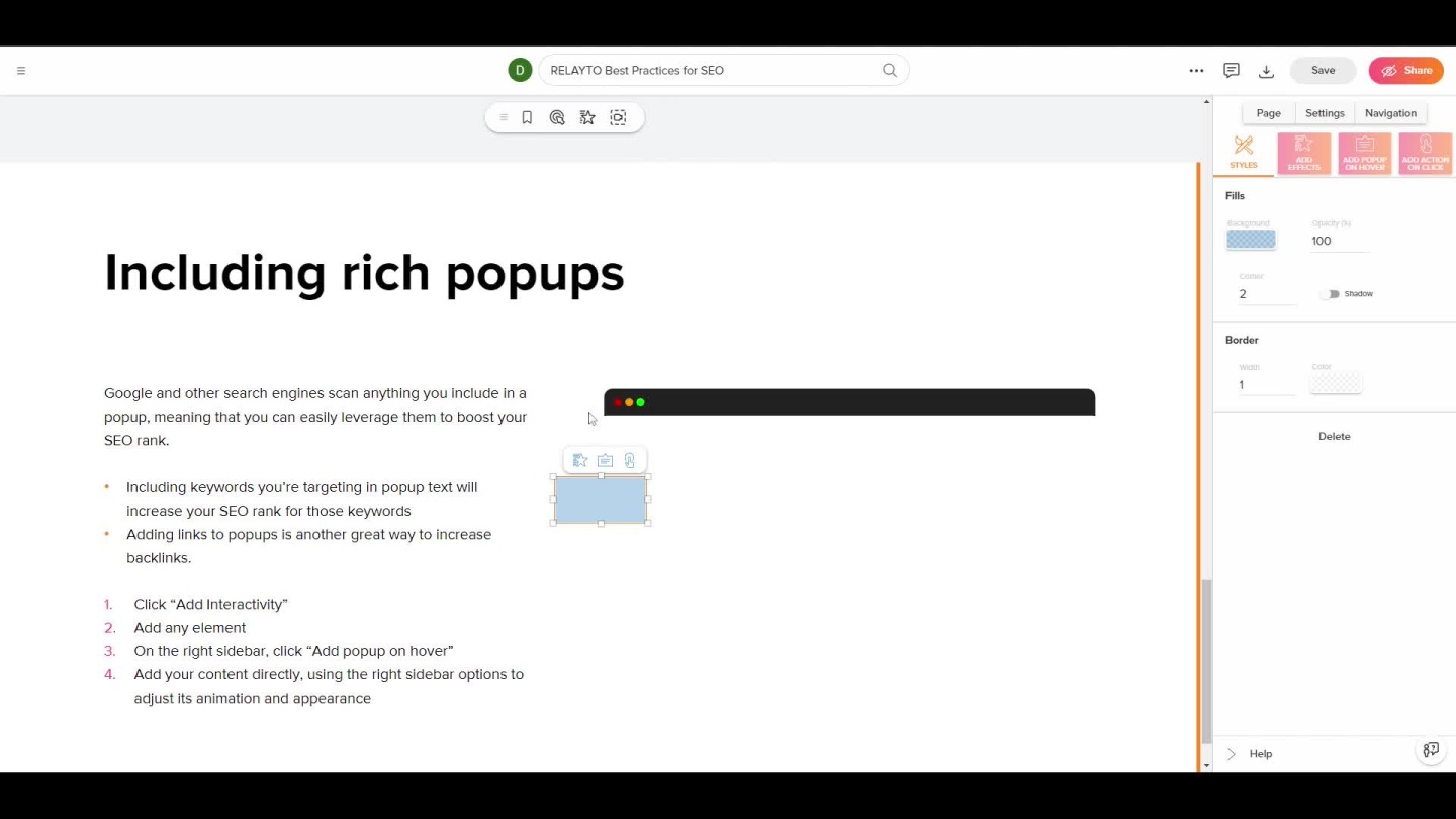 Including rich popups Google and other search engines scan anything you include in a popup, meaning that you can easily leverage them to boost your SEO rank. • Including keywords you’re targeting in popup text will increase your SEO rank for those keywords • Adding links to popups is another great way to increase backlinks. 1. Click “Add Interactivity” 2. Add any element 3. On the right sidebar, click “Add popup on hover” 4. Add your content directly, using the right sidebar options to adjust its animation and appearance
