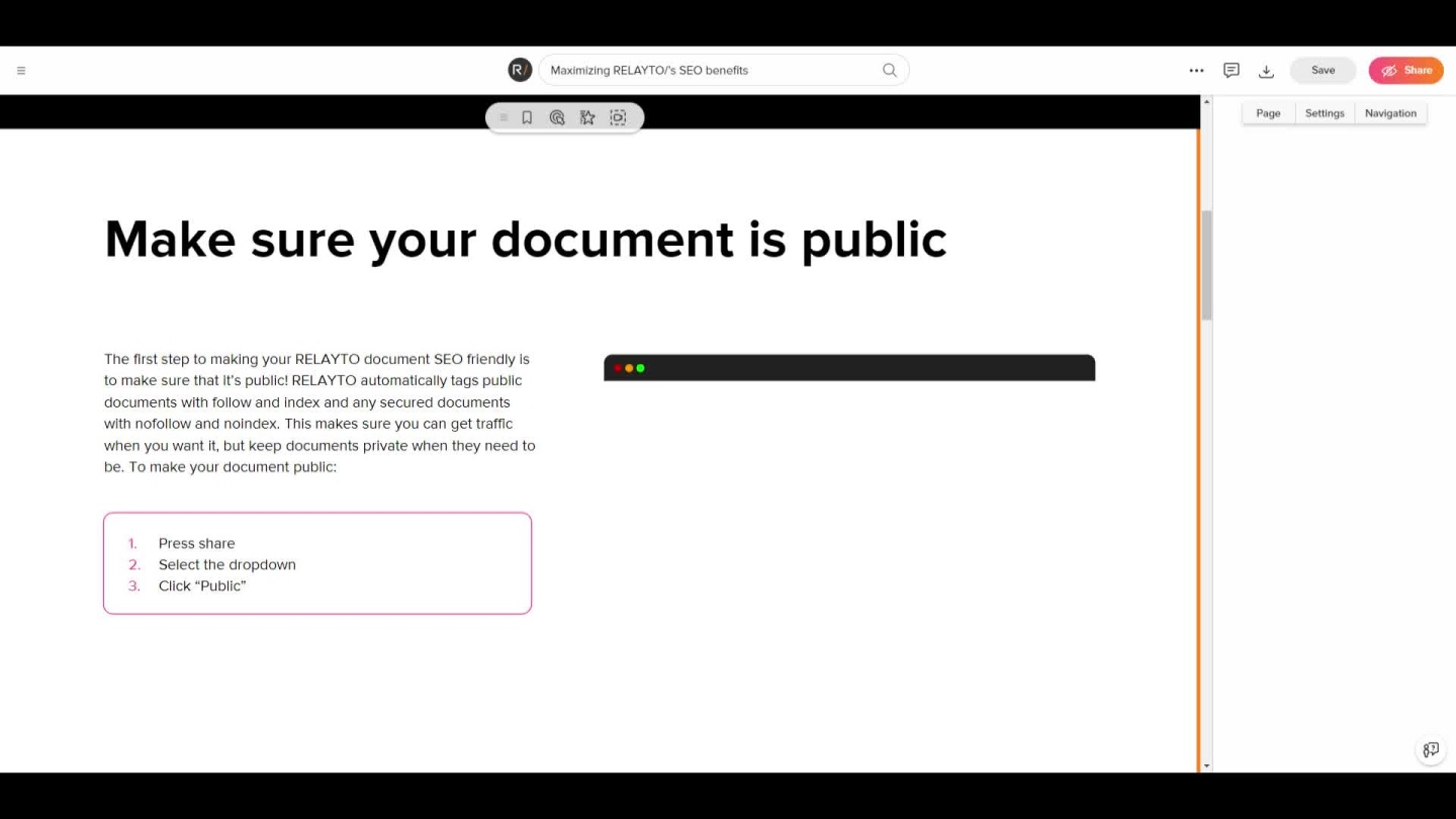 Make sure your document is public The first step to making your RELAYTO document SEO friendly is to make sure that it’s public! RELAYTO automatically tags public documents with follow and index and any secured documents with nofollow and noindex. This makes sure you can get traffic when you want it, but keep documents private when they need to be. To make your document public: 1. Press share 2. Select the dropdown 3. Click “Public”