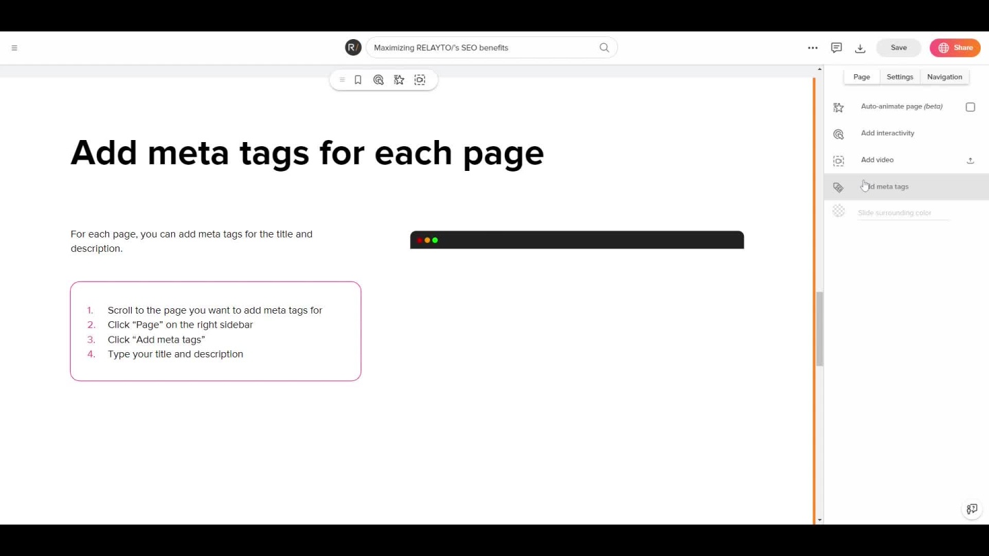 Using your title and description The title and description of your RELAYTO document will be set as its metadata. This means that the same SEO best practices you use when setting a webpage’s title and description, like using the right keywords, still apply. 1. Click “Edit” 2. Click “Settings” on the right sidebar. 3. Edit your document title and description