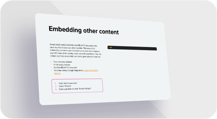 Embedding other content Google reads embedded links from RELAYTO documents the same way that it reads any other backlink. This means that embedding content in your documents is a great way to improve your SEO rank while creating a rich customer experience. You can embed any https secure links, and some great places to start are: • Your company website • A third party website • Another RELAYTO document • YouTube videos, Google Maps links, or one of our 1000+ widgets 1. Click “Add Interactivity” 2. Select “Embed” 3. Paste your link and click “Extract Widget”