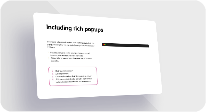 Including rich popups Google and other search engines scan anything you include in a popup, meaning that you can easily leverage them to boost your SEO rank. • Including keywords you’re targeting in popup text will increase your SEO rank for those keywords • Adding links to popups is another great way to increase backlinks. 1. Click “Add Interactivity” 2. Add any element 3. On the right sidebar, click “Add popup on hover” 4. Add your content directly, using the right sidebar options to adjust its animation and appearance