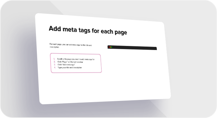 Add meta tags for each page For each page, you can add meta tags for the title and description. 1. Scroll to the page you want to add meta tags for 2. Click “Page” on the right sidebar 3. Click “Add meta tags” 4. Type your title and description