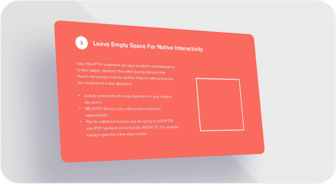 2 Leave Empty Space For Native Interactivity New RELAYTO/ customers are ways excited to add interactivity to their pages, however, they often quickly discover that there's not enough room to add the features without planning. We recommend a dual approach: • Include prominent rich media hyperlinks in your original document • RELAYTO/ Extracts your video/audio/social links automatically • Plan for additional features you are going to add AFTER your PDF has been converted into RELAYTO/. For example, enough space for a live video embed
