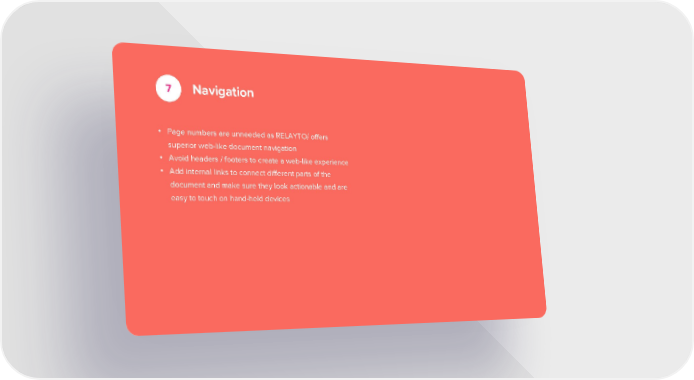 7 Navigation • Page numbers are unneeded as RELAYTO/ offers superior web-like document navigation • Avoid headers / footers to create a web-like experience • Add internal links to connect different parts of the document and make sure they look actionable and are easy to touch on hand-held devices