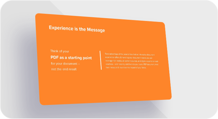 Experience is the Message Think of your Take advantage of the possibilities that an interactive document PDF as a starting point experience offers. Enhancing your document means you can leverage rich media, all content sources, and digital experience best for your document – practices - and instantly add them to your static PDF document. And not the end result then measure & maximize the impact of your ideas.