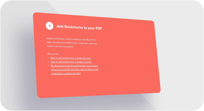4 Add Bookmarks to your PDF Added bookmarks will be extracted into RELAYTO/ table of contents or MENU and create less work and instant web-like navigation. Resources: • How to add bookmarks in Adobe Acrobat • How to add bookmarks in Adobe Indesign • For Powerpoint, Word, and Keynote convert your document to a PDF and then refer to How to add bookmarks in Adobe Acrobat