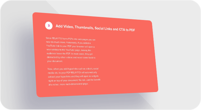 3 Add Video, Thumbnails, Social Links and CTA to PDF Since RELAYTO/ turns PDFs into web pages you can now do much more. Historically, if you added a YouTube link to your PDF your browser will open a new window to the YouTube page, making the audience leave the PDF. In most cases, they get distracted by other videos and never come back to your document. Now, when you add hyperlinks such as video's, social media etc, to your PDF RELAYTO/ will automatically extract your hyperlinks and they will open as widgets right on top of your document. No risk. Just the benefit of a richer, more multi-dimensional page.