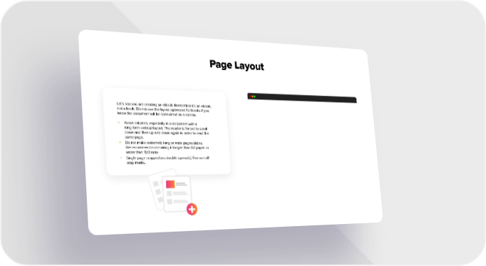 Page Layout Let’s say you are creating an eBook. Remember it's an ebook, not a book. Do not use the layout optimized for books if you know the document will be consumed on a screen. • Avoid columns, especially in a document with a long-form vertical layout. The reader is forced to scroll down and then up and down again in order to read the same page. • Do not make extremely long or wide pages/slides. We recommend not making it longer than A4 paper or wider than 16:9 ratio • Single page cropped (no double spreads). Remove all crop marks.