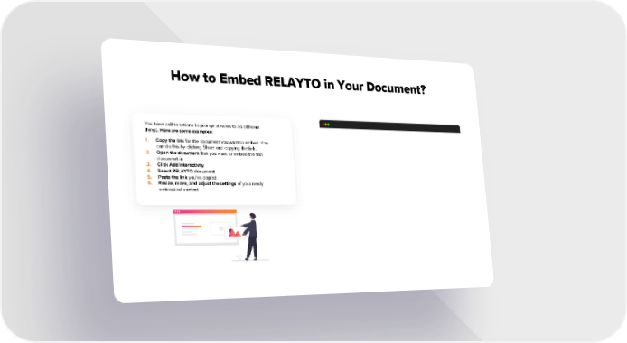 How to Embed RELAYTO in Your Document? You have call-to-actions to prompt viewers to do different things. Here are some examples: 1. Copy the link for the document you want to embed. You can do this by clicking Share and copying the link. 2. Open the document that you want to embed the first document in 3. Click Add Interactivity 4. Select RELAYTO document 5. Paste the link you’ve copied 6. Resize, move, and adjust the settings of your newly embedded content