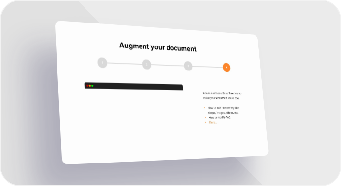 Augment your document 1 2 3 4 Check out these Basic Tutorials to make your document looks cool • How to add interactivity like shape, images, videos, etc. • How to modify ToC • More...