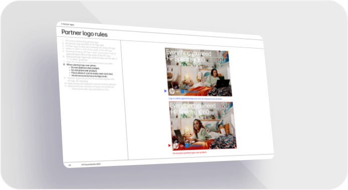 4. Partner logos Partner logo rules 1. HP comes before the partner logo. 2. All partner logo are 90% of HP logo size. 3. Partner logo is vertically centered off of the HP logo. 4. Width of “with” is 75% of the width of the HP logo. 5. Spacing between HP logo, “with,” and partner logo is approximately 25% of the width of the HP logo. 6. Space partner logos with vertical lines. Do not use “x” “—” or other “graphics.” 7. Film: Fit lockup into a ruled layout when possible. 8. When placing logo over photo: • Do not obstruct vital content. • Do not place over product. • Place where it can be easily seen and read. • Avoid excessively busy backgrounds. 9. Partner logos should be horizontally aligned with HP logo. No stacking. 10. Keep lockup left aligned in narrow vertical spaces. 11. Monochromatic versions of logos are preferred. • Monochromatic logo examples in situ. Logo is visible against background and not imposed over product. Do not place partner logos over product. 43 HP Visual Identity 2022