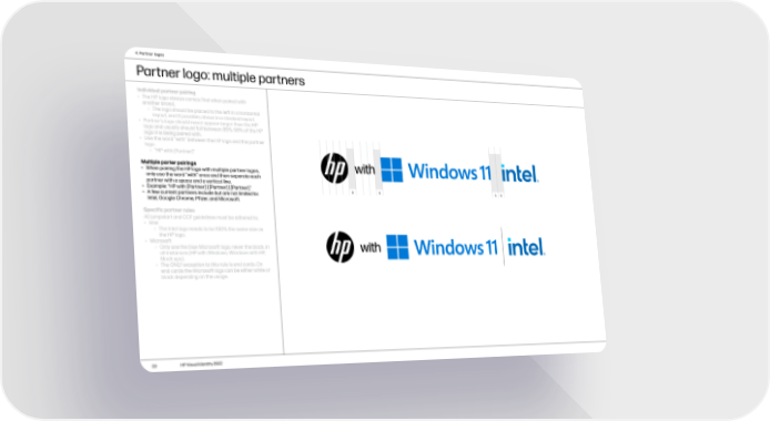 4. Partner logos Partner logo: multiple partners Individual partner pairing • The HP logo always comes first when paired with another brand. › The logo should be placed to the left in a horizontal layout, and if possible, above in a stacked layout. • Partner’s logo should never appear larger than the HP logo and usually should fall between 85%-90% of the HP logo it is being paired with. • Use the word “with” between the HP logo and the partner logo. › “HP with [Partner]” Multiple parter pairings • When pairing the HP logo with multiple partner logos, only use the word “with” once and then separate each partner with a space and a vertical line. • Example: “HP with [Partner] | [Partner] | [Partner].” x x x x • A few current partners include but are not limited to: Intel, Google Chrome, Pfizer, and Microsoft. Specific partner rules All jumpstart and CCF guidelines must be adhered to. • Intel › The Intel logo needs to be 100% the same size as the HP logo. • Microsoft › Only use the blue Microsoft logo, never the black, in all instances (HP with Windows, Windows with HP, Mock-ups). › The ONLY exception to this rule is end cards. On end cards the Microsoft logo can be either white or black depending on the usage. 33 HP Visual Identity 2022