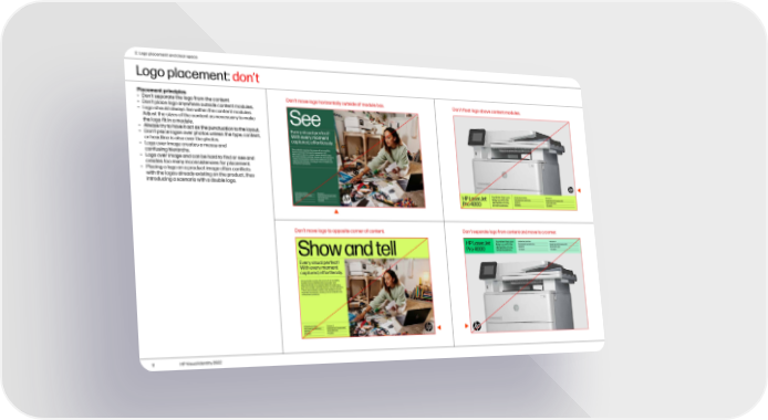 2. Logo placement and clear space Logo placement: don’t Placement principles Don’t move logo horizontally outside of module box. Don’t float logo above content modules. • Don’t separate the logo from the content • Don’t place logo anywhere outside content modules. • Logo should always live within the content modules. Adjust the sizes of the content as necessary to make the logo fit in a module. • Always try to have it act as the punctuation to the layout. • Don’t place logos over photos unless the type, content, or headline is also over the photos. • Logo over image creates a messy and confusing hierarchy. • Logo over image and can be hard to find or see and creates too many inconsistencies for placement. • Placing a logo on a product image often conflicts with the logos already existing on the product, thus introducing a scenario with a double logo. Don’t move logo to opposite corner of content. Don’t separate logo from content and move to a corner. 11 HP Visual Identity 2022